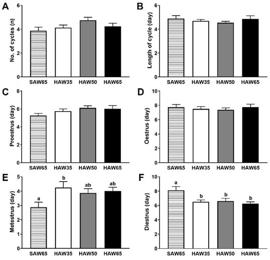 Average (A) number and (B) length in days of oestrus cycles and total number of days in (C) proestrus, (D) oestrus, (E) metestrus and (F) diestrus in female mice fed diets containing 65% standard amylose wheat (SAW65), 30% SAW and 35% high amylose wheat (HAW35), 15% SAW and 50% HAW (HAW50) or 65% HAW (HAW65) over 24 days from weeks 4 to 7. Data are means ± SEM (n = 8 mice/group). Values with different superscripts indicate significant difference (p < 0.05) by one-way ANOVA followed by Tukey’s post hoc test.