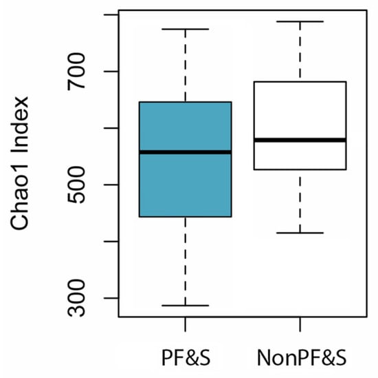 Chao1 index of gut microbial alpha diversity in participants with PF&S and in nonPF&S controls.