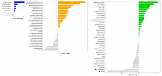 Comparison of gut microbiota relative abundance at the phylum (left panel, blue), family (middle panel, orange), and genus (right panel, green) levels between participants with PF&S and nonPF&S controls. Comparisons with a negative log2 fold change (log2FC) are represented in grey. Only comparisons with a log2FC higher or lower than ± 1.5 and an adjusted p value < 0.05 are considered significant (*).