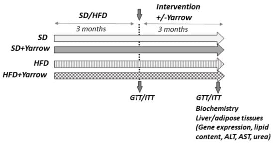 In this study, C57BL/6 mice were housed in a temperature- and humidity-controlled room with a cycle of 12 h light/darkness allowing free access to water and food. A total of 32 mice were randomly distributed in two groups according to their diets (values are referenced to the percentage of the energy they contribute—Kcal/kg): standard chow diet (SD) group (proteins 18.2%, carbohydrates 73.1%, and fat 8.6%; D40 -Rats, Mice Maintenance Diet-RMM, Safe) and high-fat diet group (HFD) (proteins 20%, carbohydrates 35%, and fats 45%; D12451 Research Diets, Inc., New Brunswick, NJ, USA). After three months with the SD or the HFD, animals of each group were randomly distributed in two additional groups for the intervention period (in the presence or absence of Yarrow SFE, 800 mg/Kg Yarrow five times per week) during three months ending up with four groups: SD; SD + Yarrow; HFD; and HFD + Yarrow. The dose was chosen based on a previous study to determine the putative toxicity of the extract in acute. Different doses ranging from 200 to 1000 mg/Kg of Yarrow SFE were administered to mice by gavage. No effects were observed on markers regardless of renal or liver dysfunctions or the animal’s general health or behavior.