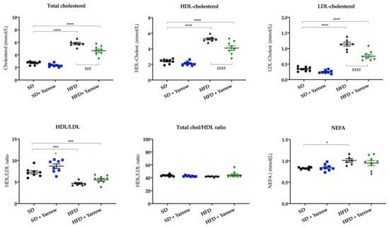Lipid prolife of SD and HFD mice treated or not with Yarrow SFE (supercritical fluid extract). Values represent the mean ± SEM of 6–8 mice per condition. Statistical differences relative to the SD group are indicated as * p < 0.05; *** p < 0.001 and **** p < 0.0001. Statistical differences found between HFD and HFD Yarrow groups are indicated as ### p < 0.001 and #### p < 0.0001.
