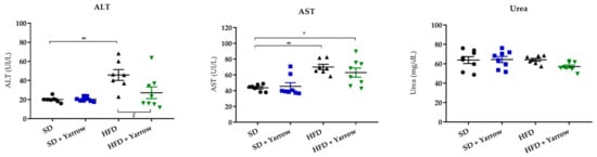 To discard any toxicity associated with the administration of Yarrow SFE after a prolonged administration (three months of intervention period), biomarkers of the hepatic and renal functions were analyzed: ALT, AST, and urea levels. As shown in Figure 5, AST and ALT levels were found increased in the HFD group compared to the SD group. Importantly, ALT circulating levels were statistically diminished in the HFD + Yarrow group compared to the HFD group. The AST circulating levels displayed a tendency to diminish, although without reaching the levels of the control SD group. Regarding the urea levels, all groups behaved similarly. These results indicated that Yarrow SFE was well tolerated.
