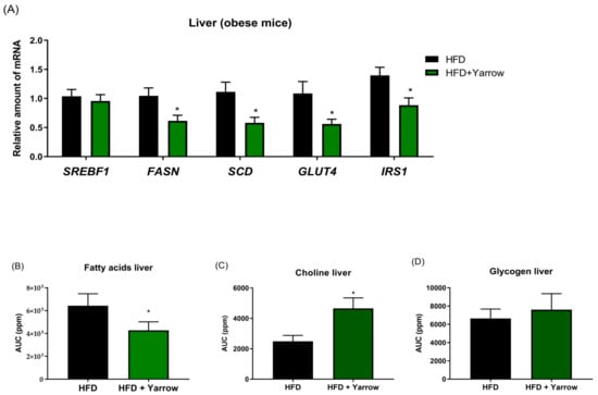 (A) Gene expression of SREBF1, FASN, SCD1, GLUT4, and IRS1 genes in livers from HFD + Yarrow and HFD groups. (B) Quantification of the relative fatty acid content. (C) Choline and (D) glycogen contents of the livers from HFD + Yarrow and HFD groups (NMR analysis of 10 mg of tissues). Data represent the mean ± SEM of 6–8 mice per condition. * p < 0.05.