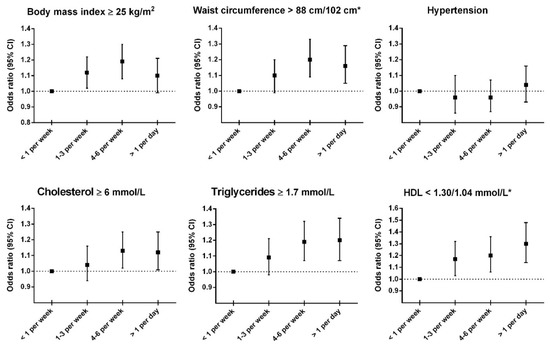 | ≥1 per day | 6036 | 0.03 | −0.03 to 0.10 | 5090 | 0.18 | 0.10 to 0.26 | |