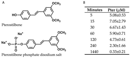 Polyphenols are characterised by poor bioavailability, mainly due to low solubility and rapid metabolism, which limit their clinical use. We decided to add a phosphate disodium group in position 4′ to increase Pter solubility (Figure 1A). The hydroxyl group in position 4′ is essential for its activity []. For this reason, we determined Pter blood levels after the subcutaneous administration of Pter phosphate disodium salt to confirm phosphatases action and the biological action of Pter (Figure 1B).