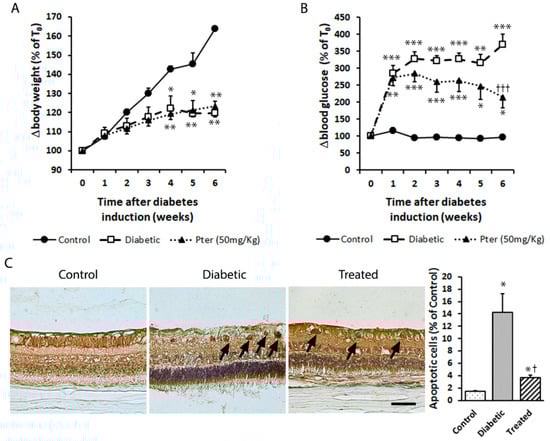 Type 1 diabetes mellitus was induced in rabbits by alloxan injection and rabbits were treated daily with Pter phosphate disodium salt (50 mg/kg of Pter) for six weeks (Treated). (A) Weight (BW) and (B) blood glucose (BG) levels were evaluated weekly. (C) Retinal apoptotic cell death was examined and quantified by TUNEL staining (black bar = 50 µm) six weeks after diabetes induction. Black arrows mark apoptotic cells. Data are presented as mean ± S.E.M. (at least n = 5 in each group). An ANOVA, followed by Tukey’s post hoc test, was used to assess significant differences between experimental conditions. * p < 0.05; ** p < 0.01; *** p < 0.001 versus the control group. † p < 0.05; ††† p < 0.001 versus the diabetic group.