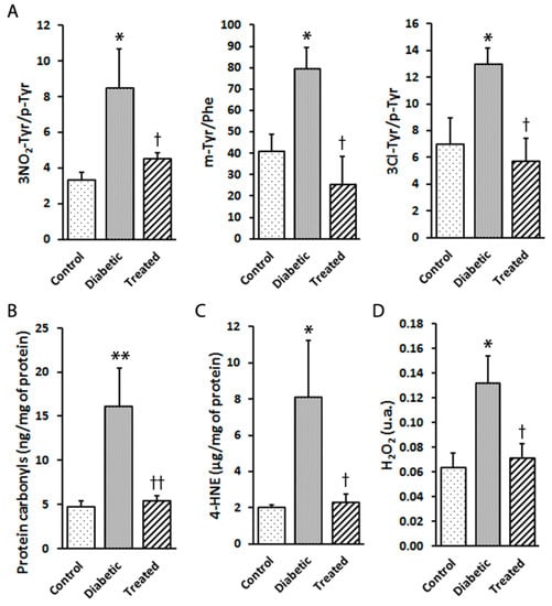 It is well-known that hyperglycaemia is a potent inductor of oxidative stress and is able to trigger increased cell damage, loss of function and DR development in the retina. Here we show effects of diabetes, such as a significant increase in retinal protein and lipid oxidation. As observed in Figure 3, Pter significantly diminished the oxidative damage induced by hyperglycaemia exposure. The effect on protein was evaluated as the mTyr/Phe, 3NO2Tyr/p-Tyr, and 3Cl-Tyr/p-Tyr ratios (Figure 3A) and carbonylation levels (Figure 3B), and lipid damage was assessed by 4-HNE quantification (Figure 3C). Moreover, hydrogen peroxide, a biologically derived stable oxidant intermediate, can inflict damage to ocular tissues by disrupting cellular structure and function. The analyses of the retinas from diabetic animals presented high hydrogen peroxide levels, while Pter lowered them (Figure 3D) to the control values, which shows the high antioxidant capability of Pter in vivo.