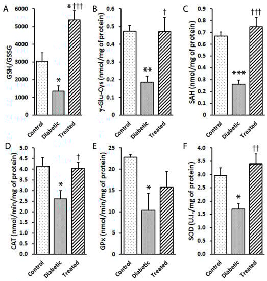 Effect of pterostilbene on antioxidant machinery activation in diabetic rabbits. Type 1 diabetes mellitus and Pter treatment were performed as described in Figure 2. The analyses of retinal (A) GSH/GSSG, (B) γ-Glu-Cys and (C) SHA were performed by UPLC-MS/MS. The enzymatic activities of (D) catalase (CAT), (E) glutathione peroxidase (GPx) and (F) superoxide dismutase (SOD) were determined by spectrophotometry. Data are presented as mean ± SEM (at least n = 4 in each group). Statistical analyses were performed by a one-way ANOVA followed by Tukey’s test. * p < 0.05; ** p < 0.01; *** p < 0.001 versus the control group. † p < 0.05; †† p < 0.01; ††† p < 0.001 versus the diabetic group.