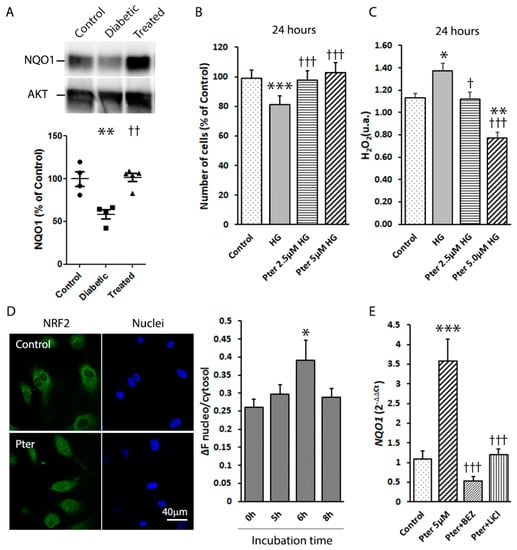 NRF2 pathway activity is overwhelmed by oxidative stress in diabetes. Thus, in order to study the potential role of Pter on NRF2 activation, the downstream NQO1 expression was analysed on retinas of control, diabetic and Pter-treated diabetic animals. According to the above-observed antioxidant protection, NRF2 activation triggered an increase in NQO1 expression in the presence of Pter (Figure 5A). To evaluate the protective role of Pter against oxidative stress induced by high glucose exposure, HREC were incubated with different concentrations of polyphenol, plus 5 mM (control) or 30 mM glucose (high glucose). The cell number significantly lowered in the presence of 30 mM glucose from the control group. Incubation, with previously determined non-cytotoxic Pter concentrations (2.5 µM and 5 µM), had a protective effect against high glucose cytotoxicity on HREC after 24 h of incubation (Figure 5B). The analyses of the HREC cells exposed to high glucose levels of the culture medium revealed that the release of hydrogen peroxide increased, while Pter lowered the levels of this ROS to the control values (Figure 5C). Furthermore, the nuclear to cytoplasmic NRF2 ratio was used as an index of NRF2 translocation (Figure 5D). NRF2 activation was maximum after 6 h of Pter incubation in HREC, which confirmed the key NRF2-dependent antioxidant role of Pter.