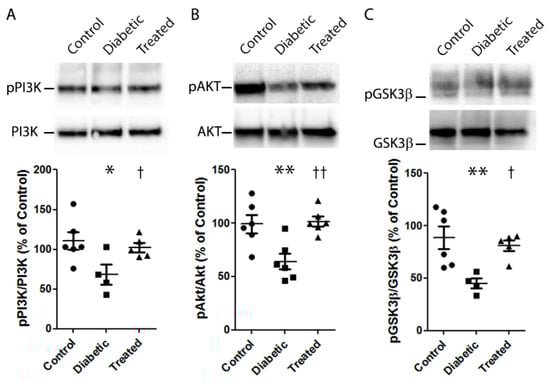 The activation of the PI3K/Akt/ GSK3β pathway is deemed an important NRF2 function trigger [,,,]. Thus, in order to investigate the molecular pathway by which Pter stimulates antioxidant protective mechanisms and reduces retinal damage, the action of PI3K and GSK3β was modulated in HREC. The mRNA levels of NQO1 were lowered by inhibiting PI3K (BEZ235) and GSK3β (lithium chloride, LiCl), and by reversing Pter-induced NRF2 activation (Figure 5E), which revealed the critical role of this pathway in Pter antioxidant action. To evaluate the effect of this stilbene in vivo, the status of the PI3K/AKT/GSK3β/NRF2 pathway was analysed on the retinas of the experimental animals. In parallel to the recovered antioxidant defences shown in Figure 4 and the increased NQO1 expression noted after Pter treatment (Figure 5A), the phosphorylation levels of PI3K, AKT and GSK3β in the diabetic rabbit retinas lowered (Figure 6), while Pter treatment recovered the values to the control levels.
