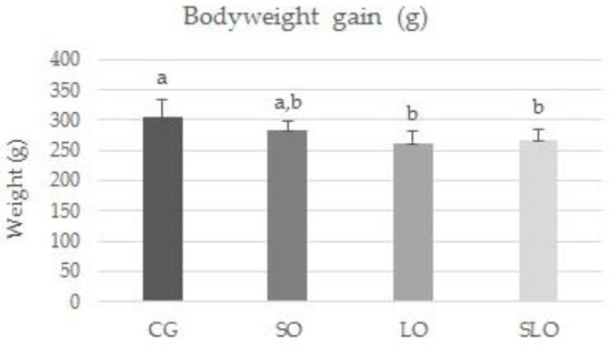 Similar results are provided in Table 3 regarding the main visceral fats of the animals (epididymal, mesenteric, and retroperitoneal). The increased PUFA in the diet of the animals, with less SFA, caused less buildup of body fat. SO, LO, and SLO groups had lower visceral fat weights compared with the CG.