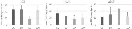 To evaluate the functional characteristics of the platelets, we investigated the activity of the enzymes of the purinergic system expressed on the surface of these cells that participate in the regulation of stimulus to the platelet aggregability. E-NTPDase and E-5′-nucleotidase are found anchored in the plasmatic membrane and have their catalytic site oriented to the extracellular medium. Figure 3 shows the activity of E-NTPDase and E-5′-NT in platelets of animals in the groups SO, LO, SLO, and CG, amongst which we observed no significant differences.