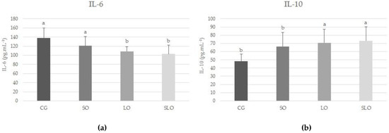 Cytokines related to immunologic and inflammatory conditions in the serum of the animals after 60 days of treatment with diets with different lipidic sources: (a) interleukin (IL)-6 and (b) IL-10. Statistical differences by one-way ANOVA test and Bonferroni post hoc (p < 0.0004 and p < 0.02).