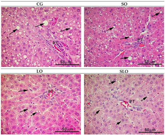 Histological analysis of the liver of the animals in CG, SO, LO, and SLO groups. Arrows indicate hepatic steatosis. CG, control group (animal fat); SO, sesame oil; LO, linseed oil; SLO, sesame oil + linseed oil.