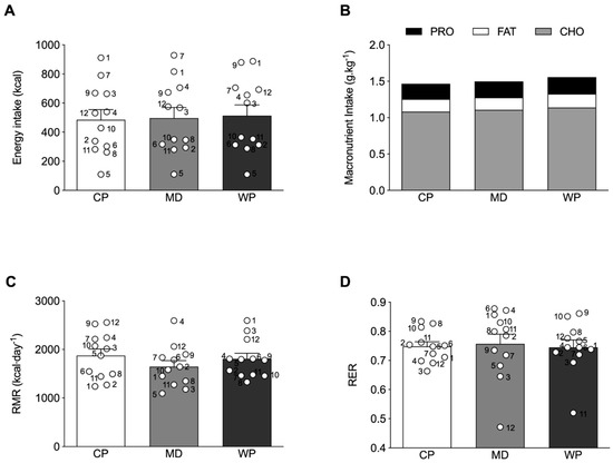 Absolute total energy intake at breakfast was not different across the treatment groups (Figure 3A), with a similar response for relative carbohydrate, fat and protein intake (Figure 3B). No differences were observed between the relative protein, carbohydrate and fat intake of the experimental ad libitum breakfast and habitual breakfast consumption, assessed by the 3-day weighed food diaries (Supplementary Table S2). Furthermore, no significant relationship between the subjective ratings of hunger before the experimental breakfast and subsequent energy intake at breakfast were observed in any of the experimental conditions (CP: r = −0.129, p = 0.689; MD: r = −0.099, p = 0.759; WP: r = −0.119, p = 0.712.). No significant differences between groups were observed for RMR (p = 0.348) and RER (p = 0.874) (Figure 3C,D).