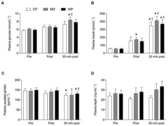 No overall and time-point specific between-group differences were observed for any of the plasma analyses (Figure 4). Glucose was significantly elevated from pre to 30 min post (p = 0.023) and from immediately post to 30 min post (p = 0.04) breakfast consumption in MD only. Insulin concentrations at 30 min post breakfast consumption were significantly increased from pre (p < 0.001) and immediately post breakfast (p < 0.043) consumption values in all three groups. Plasma insulin concentrations in MD were elevated immediately post compared with pre breakfast values (p = 0.006). Acylated plasma ghrelin concentrations were decreased 30 min after breakfast consumption compared with baseline values in CP (p = 0.038). In MD acylated plasma ghrelin concentrations significantly decreased from immediately post to 30 min post breakfast consumption (p = 0.012), whilst acylated plasma ghrelin concentrations in WP were lower 30 min post compared with pre (p = 0.029) and immediately post (p = 0.012) breakfast values. No significant within group differences were found for plasma leptin concentrations.