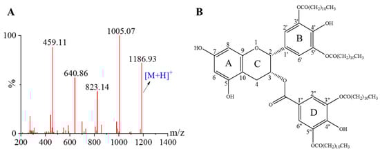 The (A) tandem mass spectrometry and (B) structure of lipophilized epigallocatechin gallate derivative (LEGCG).