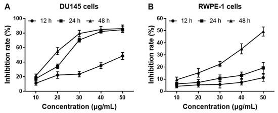 The MTT assay was used to detect the anti-proliferative potential of LEGCG on DU145 cells and RWPE-1 cells. As shown in Figure 2A, LEGCG increased the inhibition rate on human prostate cancer DU145 cells in a concentration-dependent manner at 12–48 h, within the concentrations of 10–50 μg/mL. For normal human prostate epithelial RWPE-1 cells, the inhibition rate significantly increased at 48 h of treatment (p < 0.05) and enhanced slowly at 12 and 24 h (Figure 2B). LEGCG showed only a little higher inhibition rate on DU145 cells at the concentrations of 10–50 μg/mL, for 48 h than 24 h, but it exhibited considerably high cytotoxicity on RWPE-1 cells at the doses of 40–50 μg/mL for 48 h (p < 0.05). Hence, treatment with LEGCG at the doses of 10–40 μg/mL within 24 h was selected for further study.