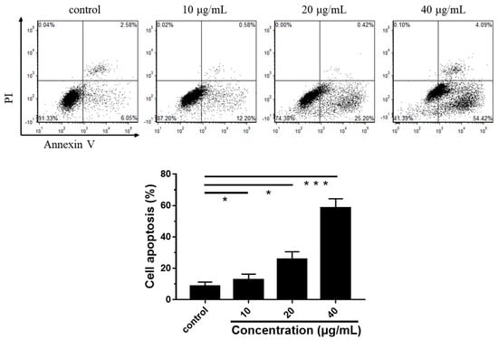 The apoptosis rate of DU145 cells was measured by flow cytometry. As shown in Figure 3, the early apoptotic cells (Annexin V+/PI− fraction) were markedly increased, and the necrotic cells (Annexin V+/PI+ fraction we) were not significantly changed. After treatment with LEGCG at 0, 10, 20, and 40 μg/mL for 24 h, the apoptosis rates of DU145 cells were 8.63%, 12.78%, 25.62%, and 58.51%, respectively. Compared to LEGCG, Gupta et al. found that EGCG treatment at 10, 20, 40, and 80 μg/mL for 48 h led to 13.9%, 19.1%, 42.2%, and 58.1% of apoptotic cells on DU145 cells [28]. And Ravindranath et al. reported that the IC50 of EGCG on DU145 cells was 88.66 μM [29]. All the results indicated that LEGCG had a more excellent anti-proliferation capacity against DU145 prostate cancer cells than EGCG.