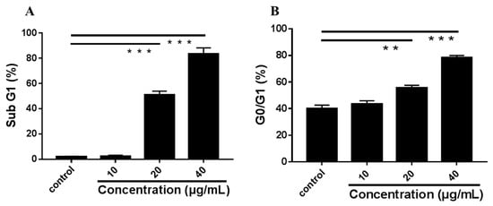 To further determine the mechanism of LEGCG-induced anti-proliferation, the effect of LEGCG on the cell cycle of DU145 cells was measured by flow cytometry. The concentrations of LEGCG at 10, 20, and 40 μg/mL were chosen. After treatment with LEGCG for 24 h, the percentages of cells in sub G1 were increased in a dose-dependent manner (1.81%, 2.30%, 50.91%, and 83.42%, respectively), which again demonstrated that LEGCG induced apoptosis on DU145 cells (Figure 4). Meanwhile, the percentages of cells in the G0/G1 phase were significantly enhanced after treatment with LEGCG at 20–40 μg/mL compared to DMSO treatment (p < 0.05). The accumulation of cells in the G0/G1 phase indicated that LEGCG arrested DU145 prostate cancer cells in the G0/G1 phase.