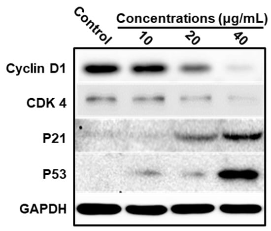 To determine these results, the immunoblot analysis of cyclin D1, CDK4, p21, and p53 were performed. Cyclin D1 is considered an oncogene and frequently overexpressed in many cancers [30]. By binding with and activating CDK4 (partner kinases of cyclin D1), cyclin D1 is known to release transcription factors to advance the cell cycle progression from G1 to S phase. Figure 5 shows that the cyclin D1 and CDK4 levels were strongly decreased by LEGCG at the doses of 20 to 40 μg/mL. P53, a tumor suppressor, inhibits the growth of tumor cells by inducing the transcription of p21, which regulates the cell cycle at the G1 to S phase and induces cell cycle arrest by inhibiting the protein expressions of the cyclin–CDK complex [31,32]. Immunoblot analysis revealed that LEGCG remarkably upregulated expression of p21 and p53 at the doses of 20 to 40 μg/mL (Figure 5). These results indicated that LEGCG induced cell cycle arrest by downregulating cyclin D1 and CDK4 levels induced by p53-dependent p21 activation.