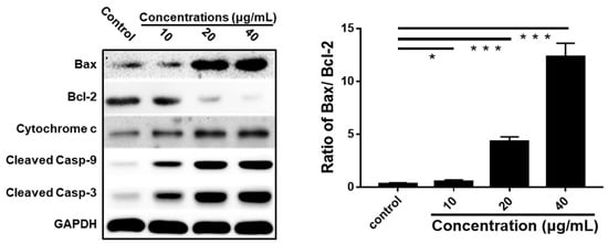 Western immunoblot analysis of the expressions of Bax, Bcl-2, cytochrome c, cleaved caspase-9, and cleaved caspase-3 on DU145 cells. Cells were treated with LEGCG for 24 h. *, 0.01 < p < 0.05; **, 0.001 < p < 0.01; ***, p < 0.001.
