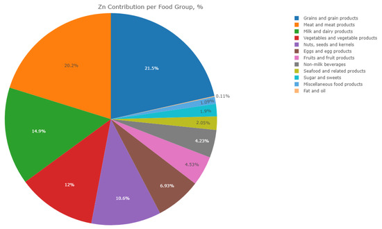 The average daily dietary Zn intake was 7.42 ± 1.82 mg/day with about 65% of study participants having intakes below the recommendations (8–11 mg/day) [55]. Grains and grain products (white and wholemeal bread) were the most significant sources of dietary Zn, contributing 21.5% to the total intake. Other important sources were meat and meat products (chicken meat) and milk and dairy products (yoghurt), with an estimated contribution of 20% and 15% to Zn intake, respectively (Table 6). Top ten food sources of Zn in participants’ diets are presented in Figure 1.