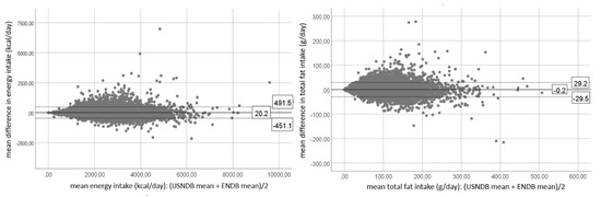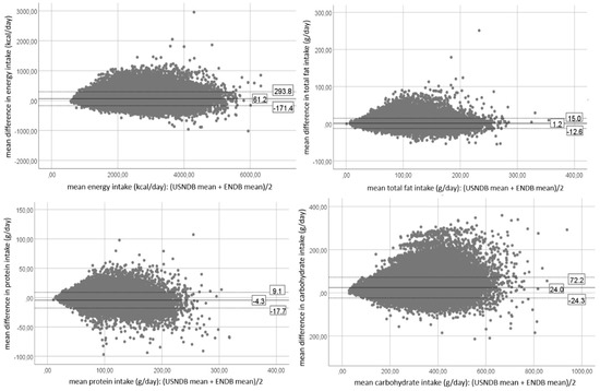 Table 2 shows the mean dietary intakes, their standard deviation and the median dietary intakes of energy and 27 nutrients, as estimated by the USNDB and the ENDB, and the absolute difference in mean nutrient intakes. Differences in mean nutrient intake between the USNDB and ENDB were statistically significant (paired samples t-test: p < 0.001) for all nutrients. Results per country can be found in Table S1. Concerning the DQ data, dietary intakes for energy, total fat and carbohydrates estimated by the USNDB were higher compared to dietary intakes calculated by the ENDB. For proteins, dietary intake measurements by the USNDB were lower. Absolute mean differences for energy and the three principal classes of macronutrients between the USNDB and ENDB were 61.2 kcal/day (3% relative to the ENDB) for energy intake, 1.2 g/day (1.5% of ENDB) for total fat, −4.3 g/day (−4.9% of ENDB) for proteins and 24.0 g/day (10.4% of ENDB) for carbohydrates. Similar results were found for the 24-HDR, the mean difference between the USNDB and ENDB for energy intake was 20.2 kcal/day (1% relative to the ENDB), −0.2 g/day (−0.2% of ENDB) for fat, −6.1 g/day (7.2% of ENDB) for proteins and 17.4 g/day (7.6% of ENDB) for carbohydrates. The strongest mean difference in dietary intake between the USNDB and the ENDB was found for starch: −72.3 g/day (−59.3% relative to the ENDB) and −76.8% (−64.7% relative to the ENDB) for the DQ data and 24-HDR data, respectively. A higher/lower dietary intake measure by the USNDB compared to the ENDB for the DQ data was systematically presented as a respective higher/lower dietary intake by the USNDB for the 24-HDR, except for the nutrients with a mean difference between −5% and 5%.
