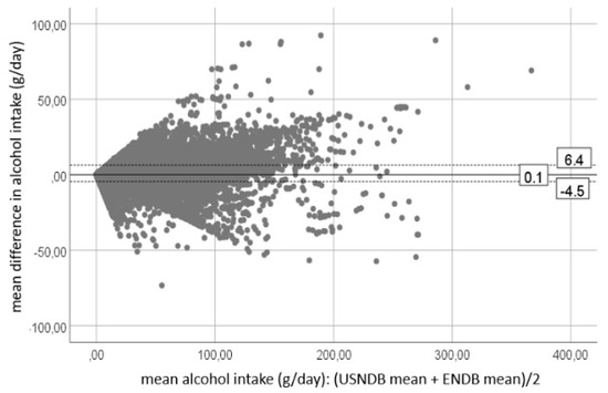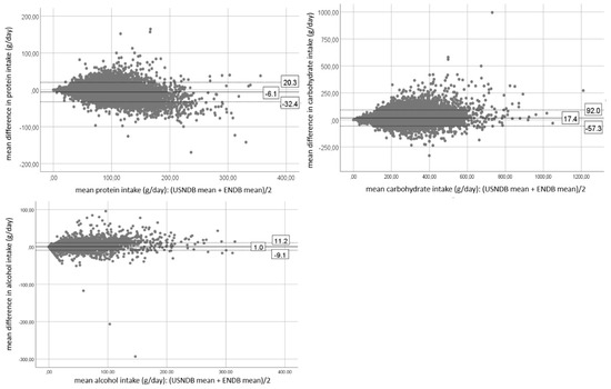 Bland-Altman plots for the 24-h dietary recall (24-HDR) data representing the mean differences and their limits of agreement for energy, total fat, proteins, carbohydrates and alcohol intakes between the U.S. nutrient database (USNDB) and the EPIC nutrient database (ENDB). The mean difference is represented by the full line, the upper and lower limit of agreement are presented by dotted lines.