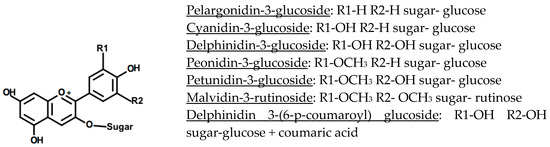 The structures of six common anthocyanins and one acylated anthocyanin, with the individual ring substituents listed below the flavylium ion backbone [9,16].