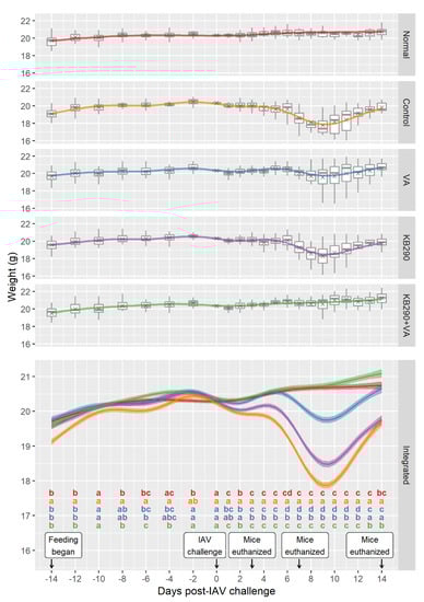 To examine the effect of orally administered KB290 and VA in combination or alone, the bodyweight, general health score (GHS), and body temperature of the animals were recorded for 2 weeks before and after IAV challenge.