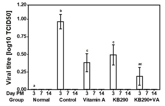 Significantly lower viral titres were observed in lungs of the VA (p = 0.01) and KB290 (p = 0.04) fed mice compared to the Control group, but these viral tires were significantly higher for the VA (p = 0.05) and KB290 (p = 0.03) groups compared to the Normal group on day 3. Mice in the KB290+VA group showed the highest reduction in lung viral titre compared with the Control group (p = 0.01), but no significant difference was observed in viral titre compared to the Normal group (p = 0.47). No virus was detected in the lungs of the mice in any of the groups at days 7 and 14 post-IAV challenge.