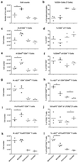 α4β7 integrin expression is decreased in activated CD4+ MLN (mesenteric lymph node) T cells of WIN 18,466-treated (WIN) mice compared to controls. Cells from MLN and PLN of mice fed WIN 18,446-containing or control diets (N = 3 mice per group) for 3 weeks were stained with antibodies in two different stains (see also Table 1), (a–h) Stain 1 and (i–l) Stain 2, and evaluated using flow cytometry. (a) Total live cell counts (hemocytometer) of MLN and PLN preparations. (b) Percent CD3+ T cells. (c) Numbers of CD4+ CD3+ T cells. (d) Percent CD4+ of CD3+ T cells. (e) Numbers of activated (CD44Hi) CD4+ T cells. (f) Percent activated (CD44Hi) of CD4+ T cells. (g) Numbers of α4β7+ activated CD4+ T cells. (h) Percent α4β7+ of activated CD4+ T cells. (i) Numbers of Foxp3+ CD4+ T (TCRβ+) cells. (j) Percent Foxp3+ CD4+ of T cells. (k) Numbers of α4β7+Foxp3+ CD4+ T cells. (l) Percent α4β7+ of Foxp3+ CD4+ T cells. * p < 0.05, ** p < 0.01, pair-wise comparisons via Student’s t-test or Mann–Whitney test. Note the different origin of y-axes in (b,d,j). Data shown are from one of two independent experiments. The second one is shown in Figure S5.