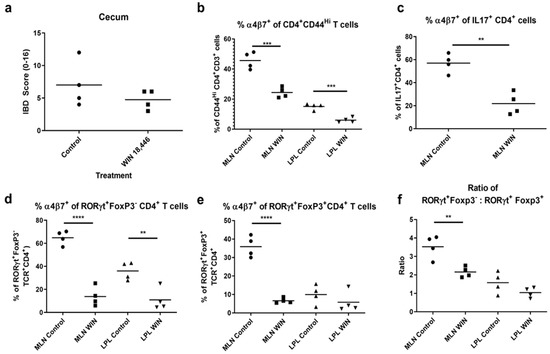WIN 18,446 treatment results in decreased α4β7 integrin expression in activated (CD44Hi) CD4+T cells, IL-17+ T cells and RORγt+CD4+ T cells and reduced Th17: induced Treg ratios in MLN and/or LPL during early inflammation. Mice were fed WIN 18,446 (WIN)-containing or control diets (N = 4 mice per group) for 3 weeks and then infected with H. bilis. Cell suspensions generated from MLN and LPL were stained with combinations of anti-CD3 or TCRβ, CD4, CD8, CD44, IL-17F, Foxp3, RORγt and α4β7 integrin antibodies in 3 different stains (Stains 1–3, see also Table 1) and evaluated using flow cytometry. (a) Histological scores of the cecum (half). Percent α4β7+ of (b) activated CD4+ T cells, (c) IL-17+CD4+ T cells (MLN only), (d) RORγt+Foxp3−CD4+ (Th17) T cells, and (e) RORγt+Foxp3+CD4+ (induced regulatory) T cells. (f) The ratio of Th17 to induced Treg cells. ** p < 0.01, *** p < 0.001, **** p < 0.0001, Student’s t test.