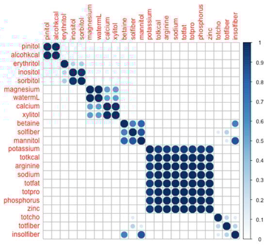 As a matter of research best-practices, there is a need to consider identifying nutrients that are consumed in consistent patterns. By finding nutrients that are consumed together, novel insights about nutritional habits, particularly in cause-and-effect relationships [,,] on health-related outcomes may be garnered. Further, taking into account nutrients that are consumed together may avoid potentially corrupting a statistical analysis by inappropriately including predictor variables that are related to one another [,,,,]. Thus, finding nutrients that are consumed together is important, whether as a building block for drawing causal inference, or as a data-conditioning step in assuring quality in a multi-variate model.