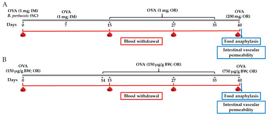 Schematic diagram of the food allergy (FA) experimental protocols. (A) FA protocol developed by intramuscular (IM) sensitization and oral (OR) challenge with ovalbumin (OVA); (B) FA protocol developed by OR sensitization and OR challenge with OVA. SC, subcutaneous; BW, body weight.