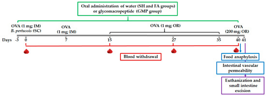 Rats were randomly assigned into three different groups (n = 24): sham control (SH), FA-induced (FA), and FA-induced and GMP-treated (GMP). The protocol of intramuscular sensitization and oral challenge with OVA was carried out in animals. Rats from GMP group received daily and orally 500 mg/kg/day of GMP (Lacprodan cGMP-10 gifted by Arla Food Ingredients Group P/S, Viby, Denmark) dissolved in sterile tap water; while for the SH and FA groups, animals received 1 mL of sterile tap water. Treatment was administered using an esophageal catheter from three days prior to the first immunization until day 40, and 4 h after OVA or NaHCO3 administration (Figure 2). The dose of GMP used in this study was established based on previous therapeutic studies in rats [32,33,34,35,36].