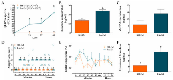 Characteristics of IgE-mediated food allergy (FA) induced by systemic allergen sensitization. (A) IgE OVA-specific titers in serum at different times measured by passive cutaneous anaphylaxis (PCA) reaction and represented as the inverse of the titer (n = 6); the values of area under the curve (AUC) were evaluated. Concentration of (B) histamine and (C) rat mast cell protease (rMCP)-2 in serum 30 and 120 min after OVA challenge at days 27 and 40, respectively (n = 3). Food anaphylaxis evaluated by (D) signs score and (E) rectal temperature of animals after the final allergen challenge at day 40 (n = 6). (F) Intestinal edema of rats after the final allergen challenge analyzed by intestinal extravasated Evans blue (n = 4, in triplicate). SH-IM, sham control of intramuscular sensitization and oral challenge; FA-IM, FA-induced by intramuscular sensitization and oral challenge. Different letters (a,b) indicate statistical difference.