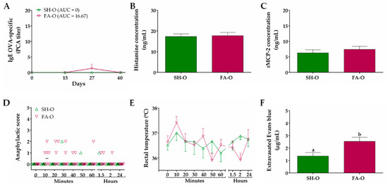 Characteristics of IgE-mediated food allergy (FA) induced by oral allergen sensitization. (A) IgE OVA-specific titers in serum at different times measured by passive cutaneous anaphylaxis (PCA) reaction and represented as the inverse of the titer (n = 6); the values of area under the curve (AUC) were evaluated. Concentration of (B) histamine and (C) rat mast cell protease (rMCP)-2 in serum 30 and 120 min after OVA challenge at days 27 and 40, respectively (n = 3). Food anaphylaxis evaluated by (D) signs score and (E) rectal temperature of animals after the final allergen challenge at day 40 (n = 6). (F) Intestinal edema of rats after the final allergen challenge analyzed by intestinal extravasated Evans blue (n = 4, in triplicate). SH-O, sham control of oral sensitization and oral challenge; FA-O, FA-induced by oral sensitization and oral challenge. Different letters (a,b) indicate statistical difference.