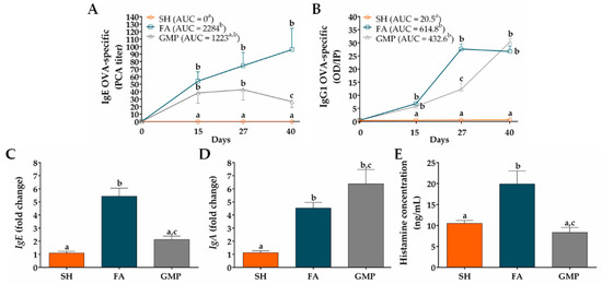 Effect of treatment with glycomacropeptide (GMP) on immunoglobulin and histamine levels in rats with food allergy (FA). (A) Ovalbumin (OVA)-specific IgE titers were measured in serum at different times by passive cutaneous anaphylaxis (PCA) reaction and represented as the inverse of the titer (n = 9); the values of area under the curve (AUC) were evaluated. (B) OVA-specific IgG1 levels were measured in serum at different times by ELISA and represented as optical density (OD) of sample in relation to positive index (PI) (n = 9); the values of AUC were evaluated. Intestinal expression level of total (C) IgE and (D) IgA relative to β-actin was analyzed by quantitative PCR and expressed as fold change (n = 4). (E) Histamine concentration was measured by ELISA in serum samples obtained 30 min after allergen challenge at day 27 (n = 9). SH, sham control; FA, FA-induced; GMP, FA-induced and GMP-treated animals. Different letters (a,b,c) indicate statistical difference.