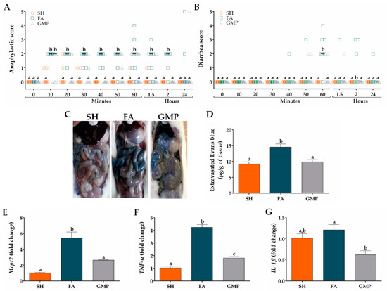 Effect of treatment with glycomacropeptide (GMP) on food anaphylaxis severity and intestinal inflammation. (A) Food anaphylaxis severity was evaluated by scoring clinical signs of animals from 10 min to 24 h after last allergen oral challenge (n = 10). (B) Diarrhea severity was scored in animals from 10 min to 24 h after last allergen oral challenge (n = 10). (C) Representative images of small intestine of animals intravenously injected with Evans blue dye and later orally challenged with allergen. (D) Graph of concentration of extravasated Evan blue within intestine and expressed as µg of dye/g of tissue (n = 5, in triplicate). Intestinal expression level of (E) Mcpt2, (F) TNF-α and (G) IL-1β relative to β-actin was analyzed by quantitative PCR and expressed as fold change (n = 4). SH, sham control; FA, FA-induced; GMP, FA-induced and GMP-treated animals. Different letters (a,b,c) indicate statistical difference.