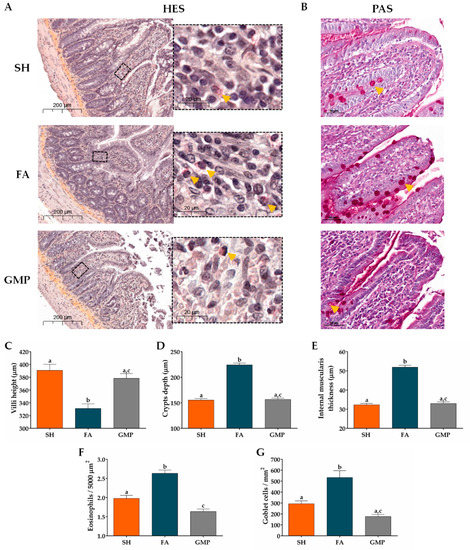 Effect of treatment with glycomacropeptide (GMP) on the pathophysiology of the intestinal mucosa in rats with food allergy (FA). Sections of jejunum were stained with (A) hematoxilin-eosin-saffron (HES) to analyze morphological alterations of mucosa and to identify eosinophils (yellow arrows), or with (B) Schiff’s periodic acid (PAS) to identify goblet cells (yellow arrows). Morphometric analysis was made with the Case Viewer 3D Histech software. The (C) villus height (μm), (D) crypt depth (μm), and (E) internal muscularis layer thickness (μm) were measured in samples of small intestine obtained from experimental animals. Quantitative analysis of (F) eosinophils and (G) goblet cells in intestinal tissue was developed in fields of 5000-µm2 and 1-mm2 surface, respectively. SH, sham control; FA, FA-induced; GMP, FA-induced and GMP-treated animals. Different letters (a,b,c) indicate statistical difference.