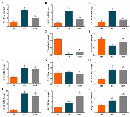 Effect of treatment with glycomacropeptide (GMP) on intestinal expression level of cytokines and transcription factors. Intestinal expression level of: cytokines (A) IL-5 and (B) IL-13 and transcription factor (C) GATA3, characteristics of type 2 immune response; cytokine (D) IFN-γ and transcription factor (E) T-bet, distinctives of type 1 immune response; cytokines (F) IL-17 and (G) IL-22 and transcription factor (H) RORγt, involved in type 17 immune response; cytokines (I) IL-10 and (J) TGF-β and transcription factor master (K) Foxp3, inductors of regulatory immune response. Expression level of all cytokines and transcription factors relative to β-actin was analyzed by quantitative PCR and expressed as fold change (n = 4). SH, sham control; FA, FA-induced; GMP, FA-induced and GMP-treated animals. Different letters (a,b,c) indicate statistical difference.