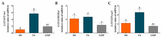 Effect of treatment with glycomacropeptide (GMP) on the skew of the immune response in the intestinal environment. Ratios of mRNA expression of (A) GATA3/T-bet, (B) GATA3/RORγt and (C) GATA3/Foxp3 in intestinal tissue of experimental groups. Intestinal expression level of transcription factors relative to β-actin was analyzed by quantitative PCR and expressed as relative ratio of mRNA (n = 4). SH, sham control; FA, FA-induced; GMP, FA-induced and GMP-treated animals. Different letters (a,b,c) indicate statistical difference.