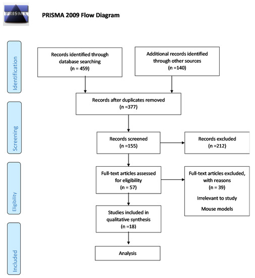 In order to identify studies that investigate any association between diet (MD adherence, or food group consumption or nutrient intakes) with HD in human subjects, a literature review was conducted using the electronic databases of PUBMED, Directory of open access journal and HubMed for studies published until November 2019. The following combination of search terms was used: “Huntington’s Disease AND diet”, “Huntington’s Disease AND dietary components”, “Huntington’s AND disease AND diet OR dietary components OR dietary patterns”. No protocol exists for this review. A total of 599 articles were retrieved from the search, 222 of which were duplicates. The abstracts were screened independently by two investigators and, if considered relevant, full articles were subsequently reviewed. Data was extracted from the identified studies, independently by two investigators, using a common data-extraction form. Studies involving animal models, non-English or irrelevant studies were excluded (Figure 1). The cited references of the identified studies were also searched for additional relevant publications. The article selection process is outlined in Figure 1. The PRISMA checklist is illustrated in (Table S1).