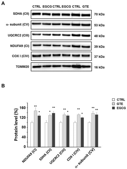 Oxidative phosphorylation (OXPHOS) complexes’ level in GTE and EGCG rat cardiomyocytes. (A) Typical electrophoretic separation and immunodetection of OXPHOS complexes in cell lysates of CTRL (n = 5), GTE- (n = 5), and EGCG-supplemented (n = 5) rats. (B) The subunit level of each OXPHOS complex was determined by means of the ImageLab analysis software and normalized to the translocase of outer mitochondrial membrane 20 (TOMM20) protein level, taken as an index of loading control. Histograms show the mean ± SEM; * p < 0.05 and ** p< 0.01 indicate the statistical significance of data compared to controls.
