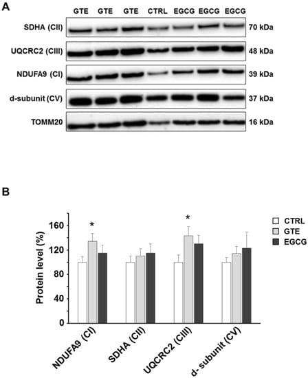 OXPHOS complexes level in GTE and EGCG rat LV tissue. (A) Typical electrophoretic separation and immunodetection of OXPHOS complexes in LV tissue lysates of CTRL (n = 2), GTE- (n = 3), and EGCG-supplemented rats (n = 3). (B) Subunit level of each OXPHOS complex was determined by means of the ImageLab analysis software and normalized to the TOMM20 protein level, taken as an index of loading control. Histograms show the mean ± SEM; * p < 0.05 indicates the statistical significance of data compared to controls.