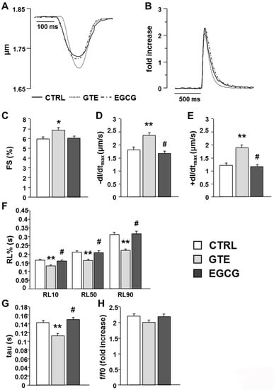 Isolated cardiomyocytes were suspended in low-calcium (0.1 mM) saline solution for 20 min, gradually brought to 1 mM Ca2+ in about 80 min, and then used for measuring calcium transients and sarcomere shortening. Mechanical properties and calcium transients were recorded by using the IonOptix fluorescence and contractility systems (IonOptix, Milton, MA, USA), as previously described []. Left ventricle (LV) myocytes were placed in a chamber mounted on the stage of an inverted microscope (Nikon-Eclipse TE2000-U, Nikon Instruments, Florence, Italy) and superfused (1 mL/min at 37 °C) with a Tyrode solution containing (in mM, all chemicals from Sigma-Aldrich): 140 NaCl, 5.4 KCl, 1 MgCl2, 5 HEPES, 5.5 glucose, and 1 CaCl2 (pH 7.4, adjusted with NaOH). Only rod-shaped myocytes with clear edges and average sarcomere length ≥ 1.7 µm were selected for the analysis. None of the selected myocytes showed spontaneous contractions. The cells were field stimulated at a frequency of 0.5 Hz by constant current pulses (2 ms in duration, and twice the diastolic threshold in intensity; MyoPacer Field Stimulator, IonOptix). A total of 66 CTRL cells, 72 GTE cells, and 78 EGCG cells were analyzed. Ca2+ transients were detected by epifluorescence after loading the myocytes with Fluo-3 AM (5 µM; Thermo Fisher Scientific, Waltham, MA, USA), previously mixed with PluronicTM F-127 (10% final concentration; Thermo Fisher Scientific, Waltham, MA, USA), for 20 min. Excitation length was 480 nm, with emission collected at 535 nm. The steady-state contraction of myocytes was achieved before data recording by means of a 10 s conditioning stimulation. The sampling rate was set at 1 kHz. The following parameters were computed: mean diastolic sarcomere length, fraction of shortening (FS), maximal rates of shortening (−dl/dtmax) and relengthening (+dl/dtmax), and time to 10%, 50%, and 90% of relengthening (RL10%, RL50%, and RL90%). Fluo-3 signals were expressed as normalized fluorescence (f/f0: fold increase). The time course of the fluorescence signal decay was described by a single exponential equation, and the time constant (tau) was used as a measure of the rate of intracellular calcium clearing [].