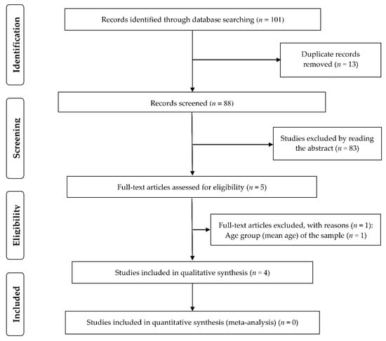 The initial database search retrieved 101 records; 13 duplicate studies were removed. Of the 88 remaining articles, which were analyzed by reading the title and abstract, 5 were selected for full-text review. Of these, four studies [43,44,45,46], all conducted in China, met the criteria for inclusion in the study: two retrospective cohort studies [43,46], a cross-sectional study [44], and a case series study [45]. Figure 1 shows the study selection flowchart.