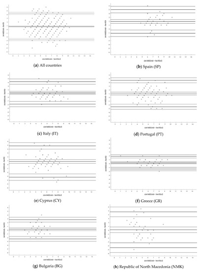 Bland–Altman plots of the differences between the results of the 14-MEDAS questionnaire and those of the 3d-FD. Y axis: DIFFERENCE (14-MEDAS—3d-FD) vs. X axis: MEAN ((14-MEDAS + 3d-FD)/2). Results are presented for: (a) All countries together, (b) Spain (SP), (c) Italy (IT), (d) Portugal (PT), (e) Cyprus (CY), (f) Greece (GR), (g) Bulgaria (BG), (h) Republic of North Macedonia (NMK).